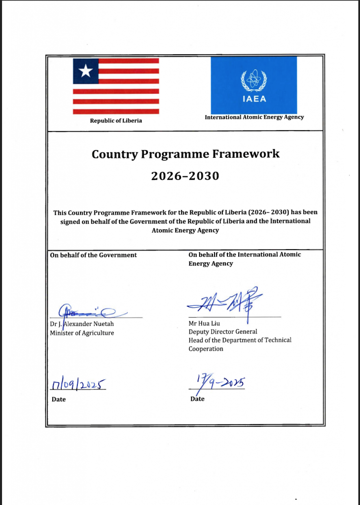 The C:PF for Liberia (2026-2030) outlines strategic areas for technical cooperation between Liberia and the IAEA, where nuclear technology can significantly support national development. The CPF is aligned with the national ARREST Agenda for Inclusive Development (2025-2029) and relevant sectoral plans. The CPF was developed through broad-based consultations involving policymakers and technical experts across multiple ministries and institutions, including the Environmental Protection Agency (EPA), Ministry of Foreign Affairs (MoFA), Ministry of Agriculture (MOA). Ministry of Health (MOH), Ministry of Mines and Energy (MME), JFK Medical Centre and the University of Liberia. The process was coordinated by the National Liaison Office and incorporated gender considerations and inclusive stakeholder engagement to reflect diverse perspectives. The CPF identifies six priority areas for technical cooperation: (i) nuclear and radiation safety and security, (ii) food and agriculture (including crop productivity. animal health, soil and water management, and food safety). (iii) human health and nutrition (including radiotherapy for cancer care). and (iv) energy and industry.