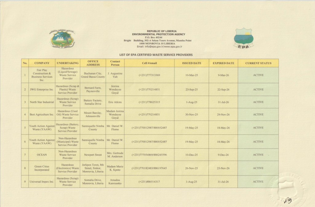 List of Environmental Protection Agency (EPA) Certified Waste Service Provider Firms For Calendar Year; 1st October – 2025, To 30th September 2026
